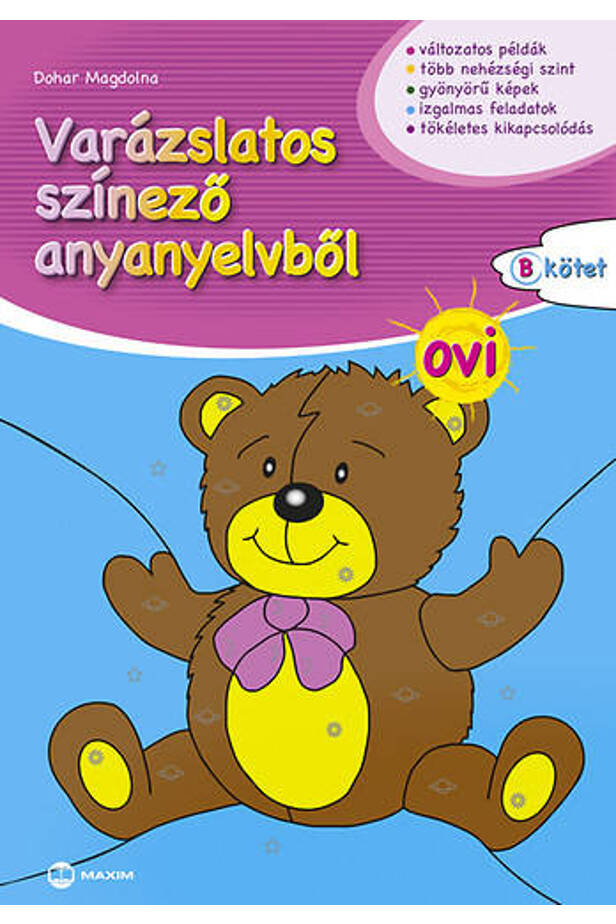 The volumes in the Magic Coloring Series offer coloring assignments in math, native language, and English for preschool and elementary school children. The level of difficulty of the coloring tasks is differentiated, gradually becoming more difficult, but at the same time it adapts to the development of the given age group, the subject and the themes of the workbook. Besides coloring, do you know? Kindergarteners can find out interesting things, titled! and we offer them thought-provoking tasks. The exercises in the workbook Ovi Volume B from the Magic Coloring Mother Tongue are good for developing children’s logical skills, while coloring contributes to developing the dexterity that is essential for learning to write in school. Your tasks provide an opportunity to work independently, to strengthen your sense of responsibility, to teach you to follow the instructions you receive, thereby improving your understanding of the task and your attention. Of the tasks of different difficulty, the easier ones give the children a quick experience of success, while the harder ones encourage the children to think and persevere. Their solution contributes to the knowledge of the environment and to the development of the aesthetic sense and representational ability of kindergarteners both in kindergarten and at home.